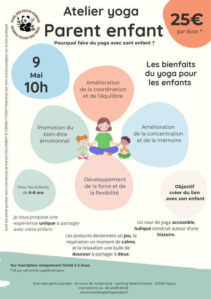 Karine d’Éveil des Petits Pandas vous propose un atelier Yoga Parent-Enfant, conçu comme une véritable aventure à partager. À travers une histoire, les enfants plongent dans un univers où chaque posture devient un défi amusant, chaque mouvement une exploration, et chaque respiration un moment de recentrage.